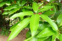 Leaves are shiny and fleshy with a sharp tip. Mango tree leaves are rich in antioxidants properties.